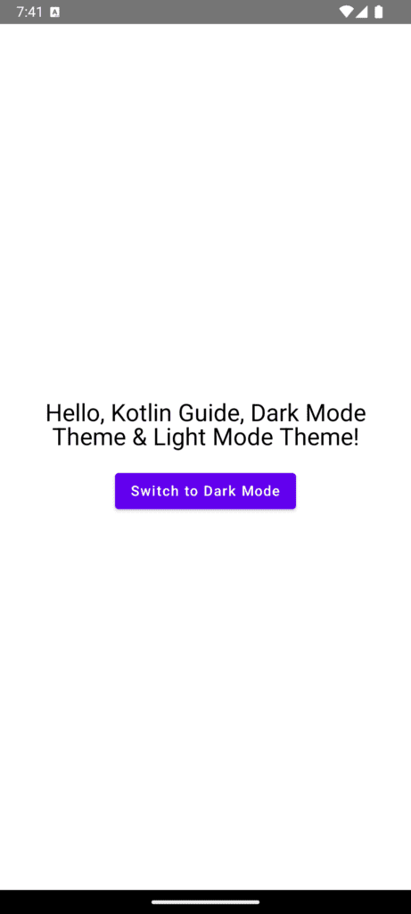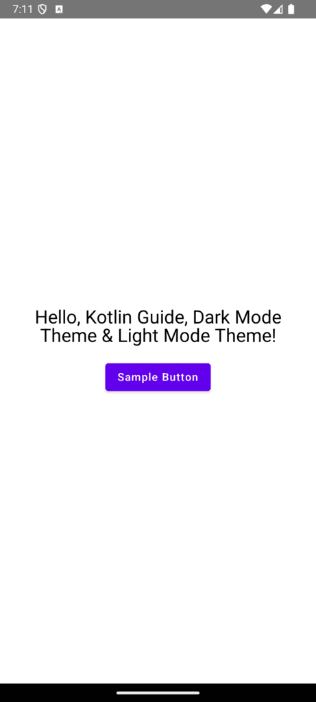 @Composable fun WelcomeScreen() { Column( modifier = Modifier .fillMaxSize() .padding(16.dp), verticalArrangement = Arrangement.Center, horizontalAlignment = Alignment.CenterHorizontally ) { Text( text = "Hello, Kotlin Guide, Dark Mode Theme & Light Mode Theme!", color = MaterialTheme.colors.onBackground, style = MaterialTheme.typography.h5, textAlign = TextAlign.Center ) Spacer(modifier = Modifier.height(16.dp)) Button( onClick = {}, colors = ButtonDefaults.buttonColors( backgroundColor = MaterialTheme.colors.primary, contentColor = MaterialTheme.colors.onPrimary ) ) { Text("Sample Button") } } } |